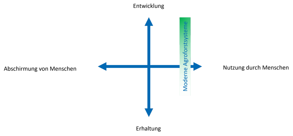 Können sich Vertreter aus dem Naturschutz und der Agroforstwirtschaft unabhängig von den recht eindeutigen abiotischen Vorteilen auf gleiche Ziele zur Förderung der biologischen Vielfalt verständigen? Wichtig ist zunächst zu verstehen, wie die Ziele verfolgt werden. Das strategische Vorgehen des Naturschutzes – sei es in Schutzprojekten oder durch politische Förderung – lässt sich in einem zweidimensionalen Koordinatensystem verorten (Abb. 1). Vertikal eingeordnet wird der Grad der notwendigen Veränderung, um einen gewünschten Zielzustand zu erreichen (von Erhaltung bis Entwicklung) und andererseits der Grad der Mitgestaltung durch das menschliche Handeln (von Abschirmung bis Nutzung). In diesem Koordinatensystem sind bei-spielhafte Typen von Naturschutzprojekten verortet.