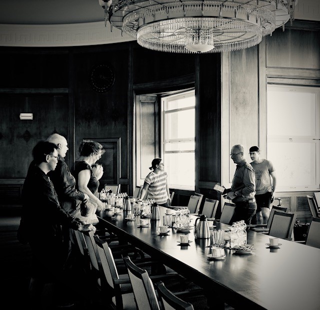 Im Rathaus sprachen wir über Möglichkeiten, Grenzen und vor allem Notwendigkeiten der Kommunen im Blick auf Frustrationserfahrungen von Bürgerinnen. OB Schenk sprach von den zwei »F« – Finanzen und Fachkräfte, die ein besonderes Problem darstellten. Die Kommune müsse in der Lage sein, Pflichtaufgaben und kurzfristige Probleme zuverlässig zu bewältigen. Bitterfeld war hochverschuldet und dadurch nur sehr eingeschränkt handlungsfähig. Durch einen deutlichen Sparkurs konnte der Haushalt saniert werden. Das hat aber die Stimmung in der Stadt nachhaltig beeinflusst. »Das System« wurde als dysfunktional empfunden. Zusätzlich zu den Verwerfungen in der Pandemie führte das Spannungen und Konflikten im Stadtleben. Ebenso ist es schwierig, wenn zu wenige Ärztinnen und Ärzte in der Stadt arbeiten oder auch andere Angebote knapp sind, die für eine Kommune wichtig sind. Auch, wenn dafür nicht unmittelbar »die« Parteien oder »die Politik« verantwortlich sind, sorgt dieser Zustand für Unmut. In der Diskussion beschäftigte uns die Frage, wie Bürgerinnen stärker beteiligt werden und wie sie für diese Beteiligung motiviert werden könnten. Dabei kam auch die Frage nach politischer Bildung auf.