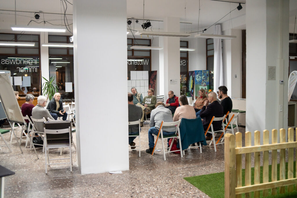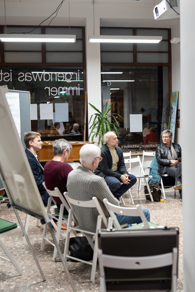 Warm und einladend: ein Platz zum Nachdenken und Ausprobieren. Auf den Stühlen und am Buffet tummelten sich Wittenbergerinnen und Wittenberger. Die Ladenfläche in der Marktstraße 3, die derzeit vom Stadtlabor Wittenberg betrieben wird, wirkte vor drei Tagen noch kalt und leer. Doch nun füllten unterschiedliche – teils gegensätzliche – Erfahrungen, Perspektiven und Meinungen den Raum. Die Gespräche überhitzten jedoch nicht. Der Umgang miteinander war respektvoll und geduldig.