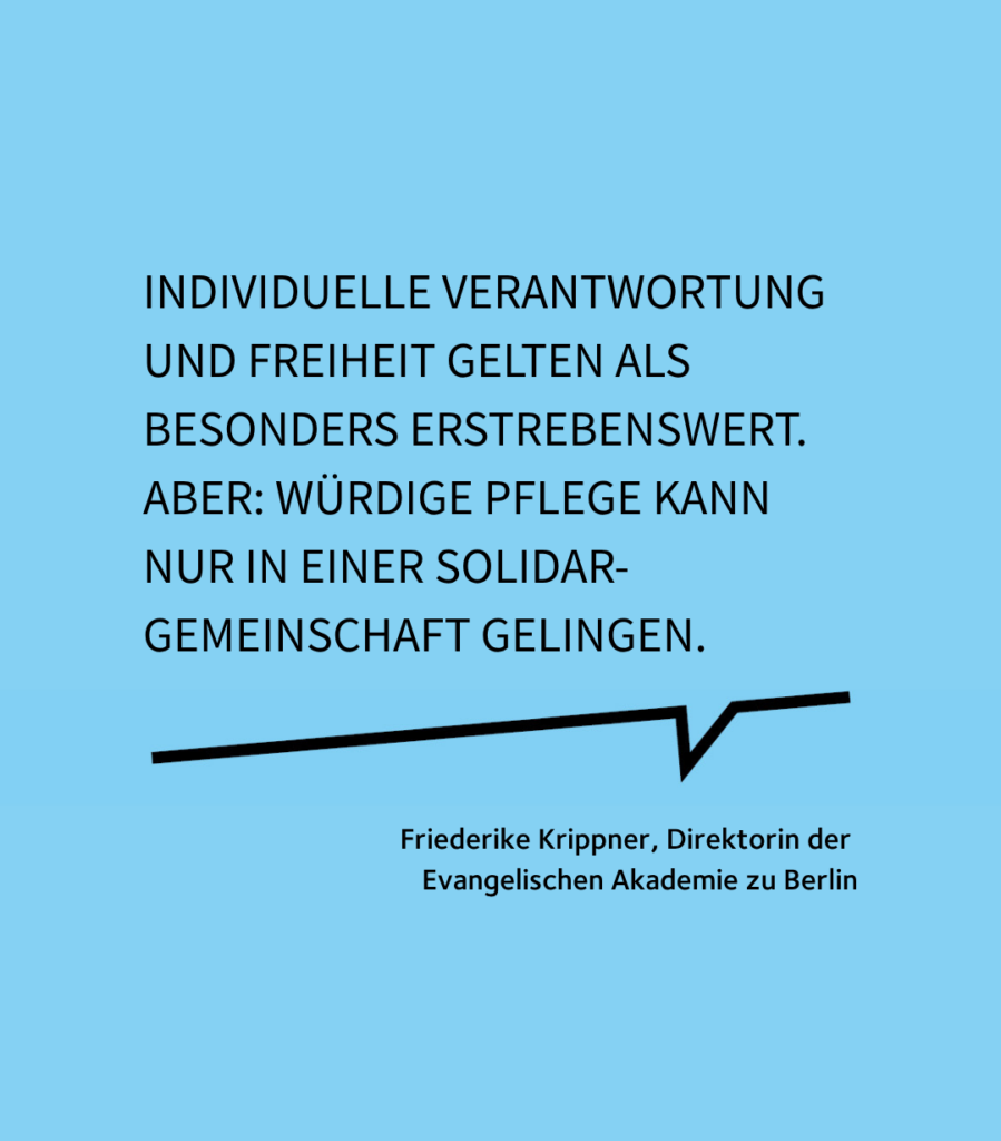 Die Direktorin der Berliner Akademie, Friederike Krippner, beobachtet, dass Veranstaltungen zum Pflegethema viel weniger Resonanz erfahren als etwa Veranstaltungen zum assistierten Suizid. Dies mache nachdenklich, weil sich dahinter möglicherweise eine tiefliegende Diagnose für die Gesellschaft verberge: „Individuelle Verantwortung und Freiheit gelten als besonders erstrebenswert. Aber: