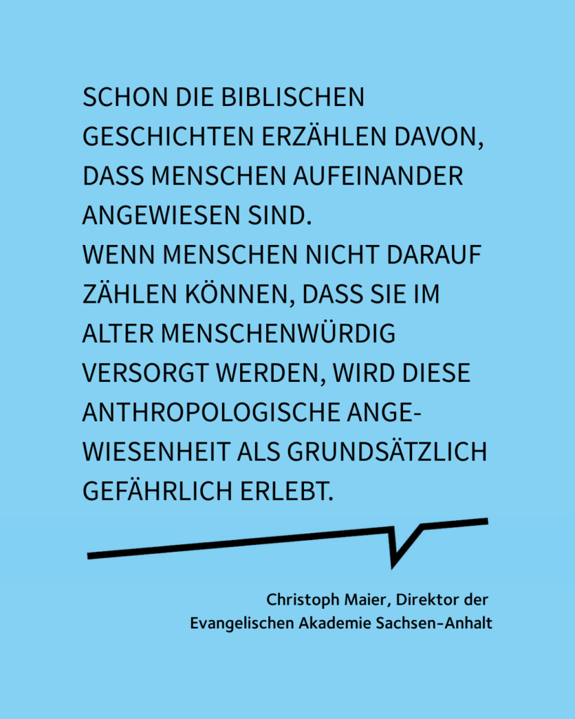 Diese Krise sei mittlerweile existenziell. „Schon die biblischen Geschichten erzählen davon, dass Menschen aufeinander angewiesen sind“, betont der Theologe: „Wenn Menschen nicht darauf zählen können, dass sie im Alter menschenwürdig versorgt werden, wird diese anthropologische Angewiesenheit als grundsätzlich gefährlich erlebt.“ Dies könne zu einer Vertrauenskrise führen – in andere Menschen, aber auch in die Funktionsfähigkeit des Staates.