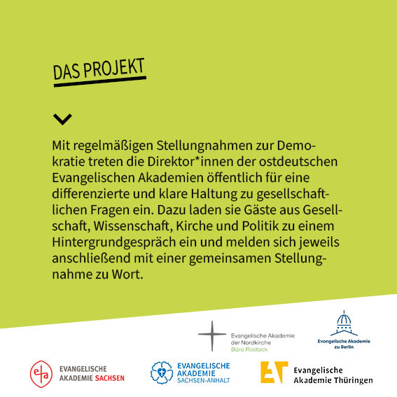 Die Direktoren und Direktorin der Evangelischen Akademien in Ostdeutschland debattieren seit Anfang 2024 regelmäßig in einem Fachgespräch mit Wissenschaftlerinnen, Medienvertretern und Theologen. Mit einem Fokus auf Ostdeutschland sprechen sie dabei über den Druck, der derzeit auf der liberalen Demokratie lastet, und über den Umgang mit rechtsradikalen Parteien. Die Essenz dieser Gespräche veröffentlichen die Akademien als gemeinsame Stellungnahmen zur Demokratie.